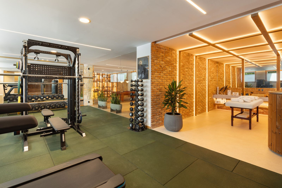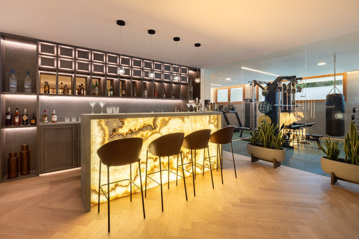 Esta propiedad presenta una gama de comodidades personalizadas, como un gimnasio en casa totalmente equipado,