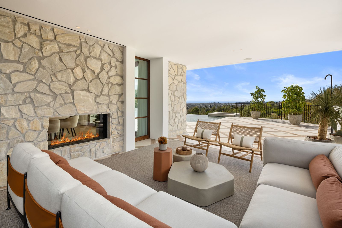 Estate design. The room is further enhanced with luxurious stone and wood details, and a