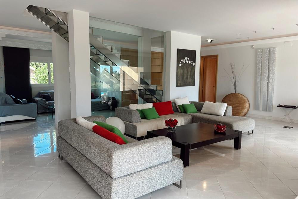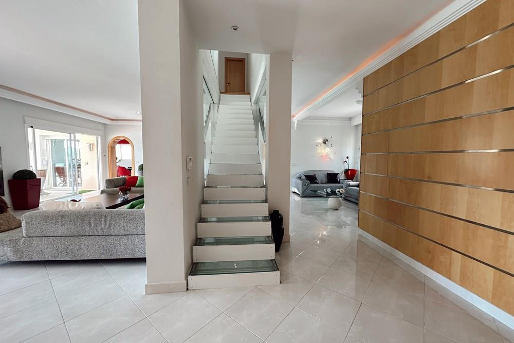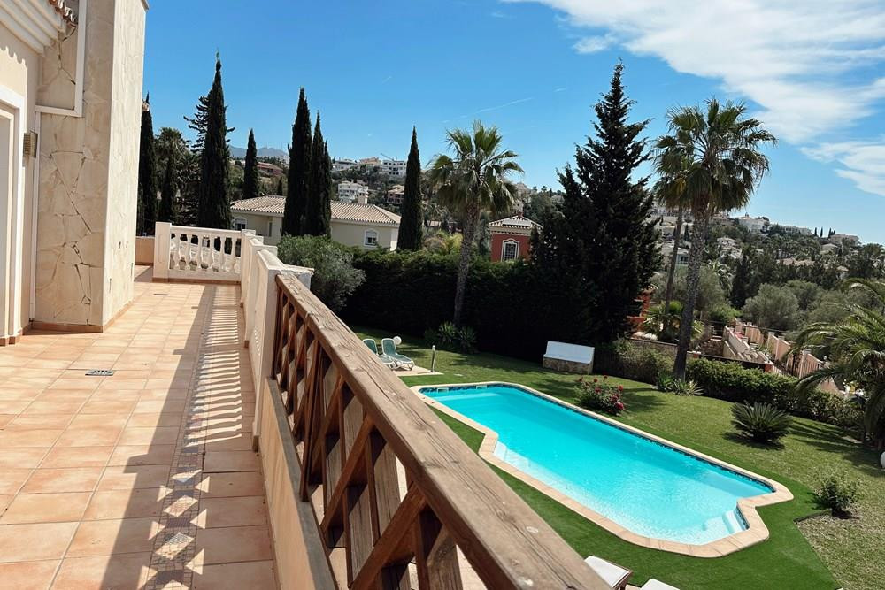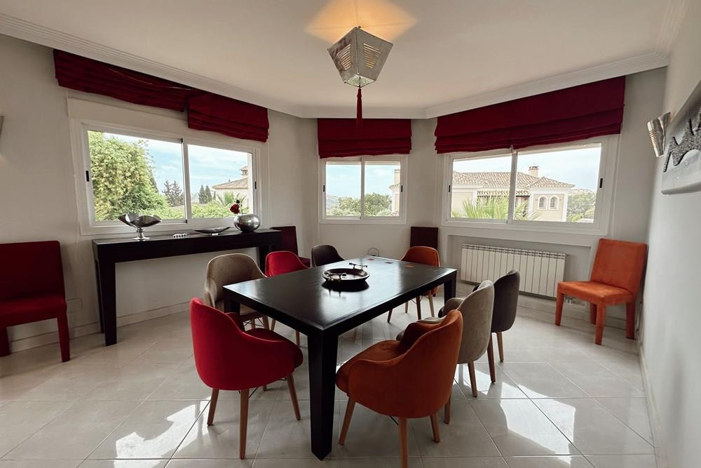 Maravillosa y lujosa villa independiente, ubicada en la prestigiosa zona de Mijas Golf con orientación Sureste.Esta villa tiene 567m2 construido, 1200m2 de parcela y se distribuye en tres niveles. En la planta principal nos encontramos con un amplio salón con chimenea, un luminoso comedor, una cocina totalmente equipada, lavadero, un cuarto de uso oficina, aseo de invitados y el dormitorio principal en-suite con vestidor y cuarto de baño con ducha de hidromasaje y bañera empotrada en el suelo. Esta habitación tiene acceso directo a la terraza principal con vista a la piscina y jardín como el salón.La primera planta dispone de tres amplios dormitorios y dos baños. Todos los dormitorios ofrecen armarios empotrados y tienen acceso a una gran terraza de 40m2 con vistas a la piscina y al campo de golf.En la planta sótano tenemos el quinto dormitorio, un baño, un sauna para 4 personas, una bodeguita, una amplia sala de juego y dos cuarto de almacenamiento.Las características de alta calidad incluyen A/C frío y calor, suelos de mármol, calefacción por suelo radiante, aspirador central, sistema de alarma sofisticado con sensores perimetrales de movimiento, TV vía satélite, Sistema de Domótica incluyendo: Luces, persianas, A/A frío/calor, sistema de música.La propiedad incluye 2 plazas de aparcamiento, piscina con cuarto exterior de ducha y aseo, zona de barbacoa y zona de arboles frutales (nispero, limones, naranjas, granados, almedro, olivos…)La vivienda se encuentra a tan solo unos minutos de tiendas, bares, restaurantes y escuelas internacionales, a 10 minutos de Fuengirola, 25 minutos del aeropuerto internacional de Malaga y a 20 minutos de Marbella. A pesar de ser una zona tranquila, Mijas golf conquista el corazon de personas de todas partes del mundo. Es internacional y multicultural. Los diferentes desarrollos y obras nuevas se concentran en torno a los campos de golf Los Olivos y Los Lagos.NGS